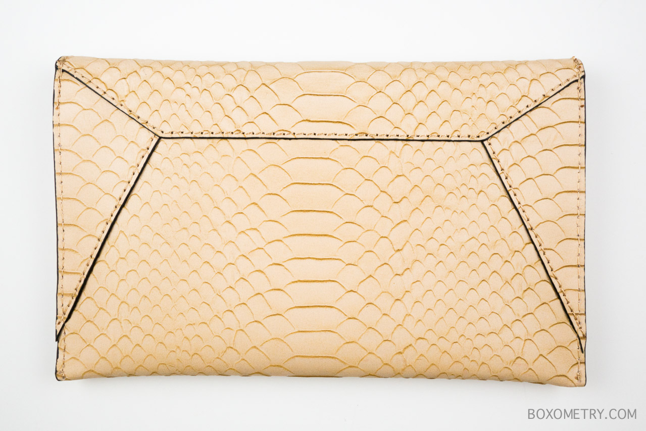 The Loeffler Randall Envelope Clutch in nude python embossed leather is well made and beautiful. It has a fabric lining inside with off-white colored dots against a black background. The clutch measures 8.5" wide x 5.5" tall, and can easily fit small accessories and a cell phone. Although I prefer purses and don't carry clutches often, I really like this one so I'll definitely find an opportunity to use it!