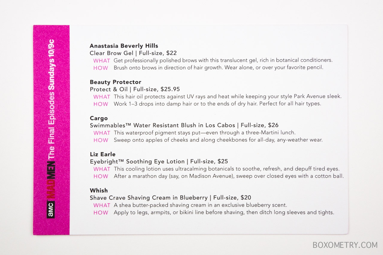 Final Thoughts: While I am not overly excited about all of the products, I do like the Mad Men collaboration and the limited release outer box. The Anastasia Beverly Hills eyebrow gel works fine, but nothing spectacular. I'm glad I got to sample it instead of investing in a full-size version. I've been making sample selections every month, so I am going to let Birchbox surprise me for the upcoming month to see what they come up with.