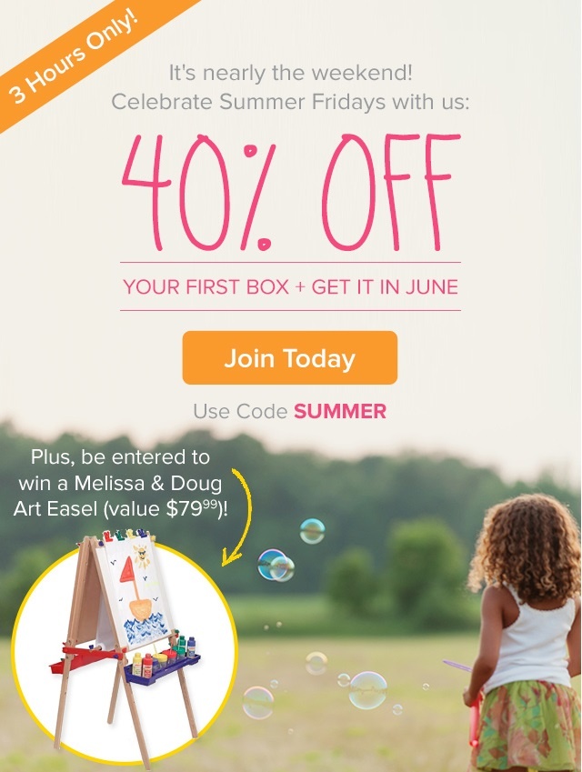 Terms and Conditions: 40% off your first box: SUMMER valid for new or inactive Citrus Lane customers that purchase a self-subscription. Cannot be combined with other promotions, retroactively applied, or applied to prior purchases and is valid until 2:00pm PT, June 5, 2015 or while supplies last. One per household. Subscriptions automatically renew to full retail price. You may cancel anytime after receiving your first box. Shipping is free for subscription packages sent within the contiguous 48 states. Once order is placed you will be automatically entered for a chance to win an Melissa & Doug Art Easel. For more information, see the official rules here.
